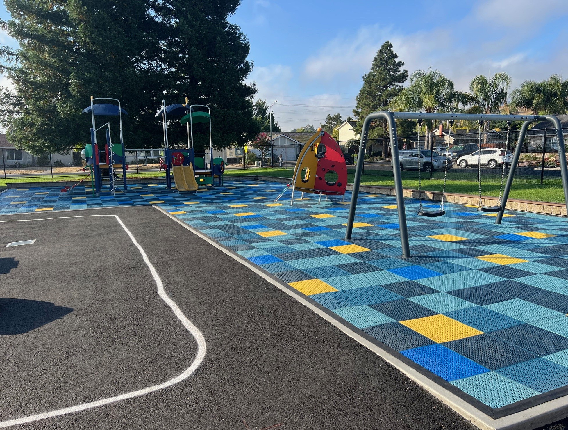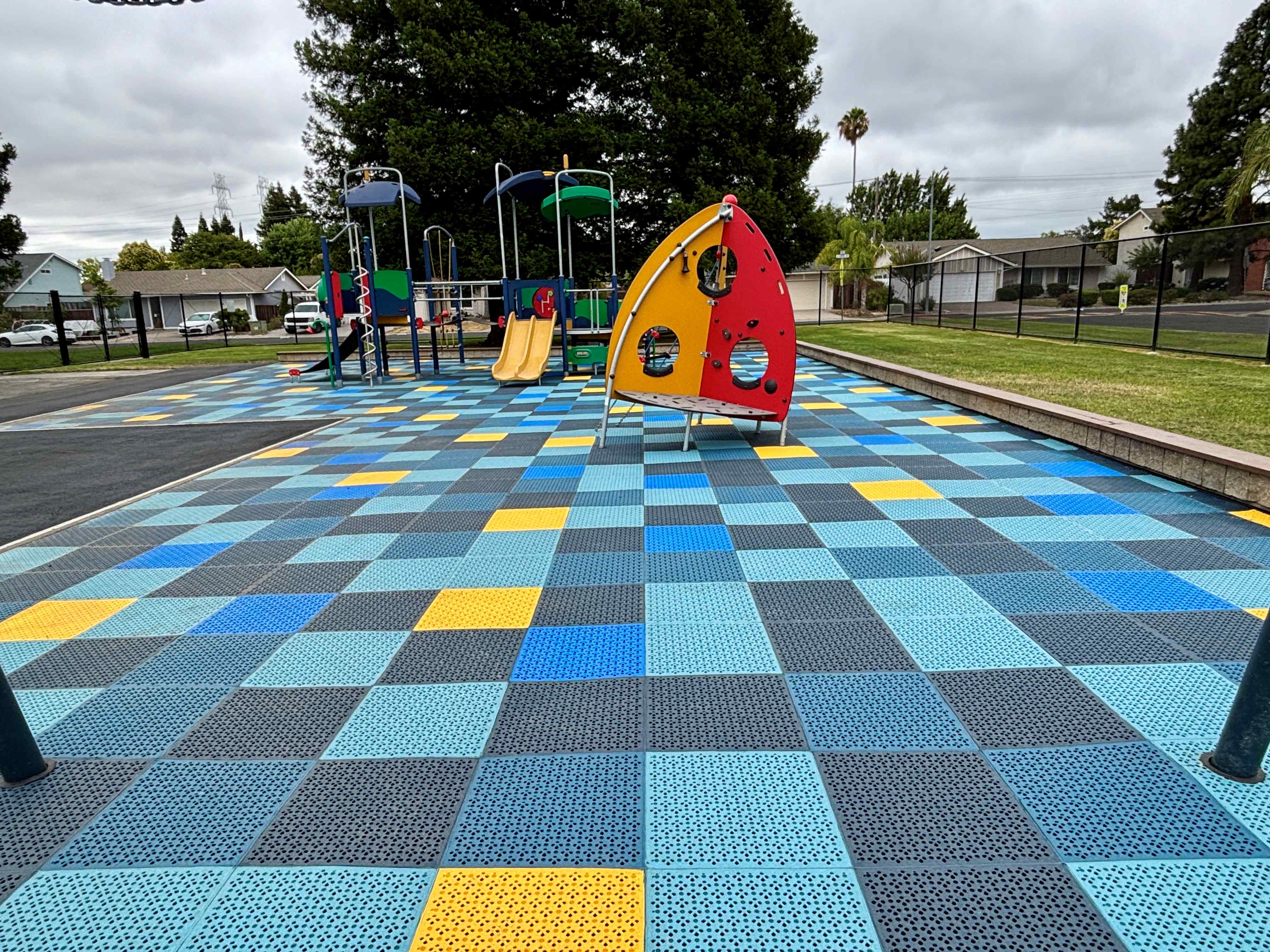 The existing loose-fill surface and border were removed, and Play Matta Original tiles were installed over our foam shockpads. The new surface provides a free-draining, ADA-accessible play area with a consistent 7 ft Critical Fall Height—without the frequent maintenance demands of EWF. The smooth, even surface has improved accessibility and reduced the time and cost of upkeep for the district’s maintenance team.